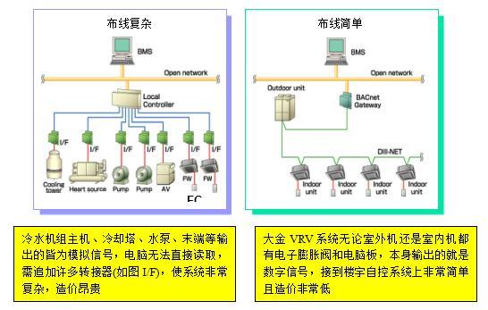 C. VRV系統(tǒng)還提供能夠同時(shí)制冷制熱的熱回收式VRV,熱回收式VRV可以在同一個(gè)系統(tǒng)內(nèi)同時(shí)制冷制熱。比如說(shuō),一般計(jì)算機(jī)房是需要全年制冷的,普通系統(tǒng)在冬季就無(wú)法給計(jì)算機(jī)房供冷(在其他房間都制熱的情況下),而熱回收式VRV就能做到這一點(diǎn)。如果采用傳統(tǒng)的冷水機(jī)組,則需采用四管制系統(tǒng)才能達(dá)到這一要求。