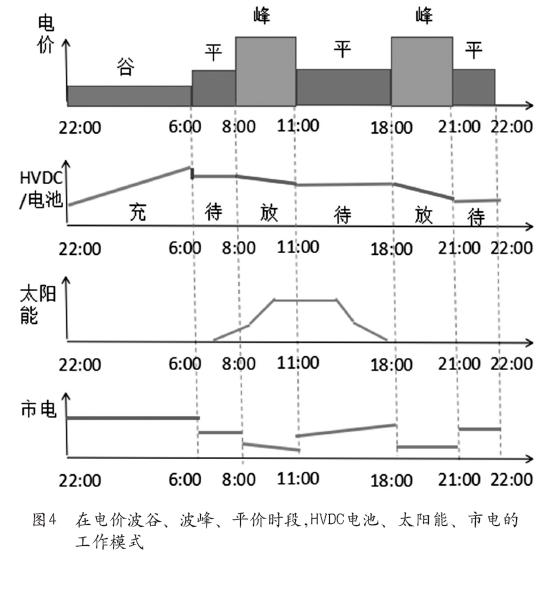 高壓直流型儲能方案如圖3所示,它打造了一個直流微網的方案,通過高壓直流給電池充電,同時給設備供電。這套方案可以將光伏、風機無縫并到直流系統里面,組成儲能系統,但是原有系統卻無需改造。在電價波谷、波峰、平價時段,HVDC/電池、太陽能、市電的工作模式如圖4所示。