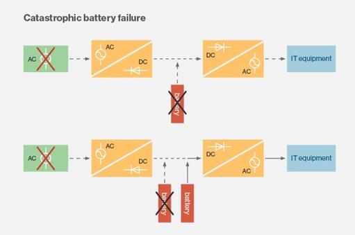 所有UPS系統(tǒng)都需要兩組電池串來防止在其中一組出現故障時出現災難性故障。