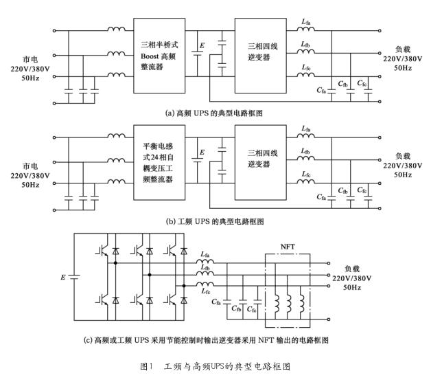 2009年,在《UPS應(yīng)用》的組織發(fā)動下,進(jìn)行了一場工頻與高頻UPS的大辯論,結(jié)果是高頻UPS獲勝。工頻UPS失敗的原因是:SCR多相相控整流是一個(gè)時(shí)滯環(huán)節(jié),無法實(shí)現(xiàn)輸出電壓的快速調(diào)節(jié),并會導(dǎo)致市電電網(wǎng)電壓畸變,對市電*大,輸入功率因數(shù)低、效率低、體積重量大,直流電壓調(diào)節(jié)為非線性,對市電電壓波動適應(yīng)能力差,不能數(shù)控等而被淘汰。此后,由于采用平衡電感24相自耦變壓工頻整流器和采用自耦變壓器的多相工頻整流與 U d -PWM控制的研制成功,使工頻UPS的性能完全趕上了高頻UPS,但是高頻UPS的開關(guān)損耗要大8~33倍[視高頻UPS的開關(guān)頻率(10~20)kHz,與工頻UPS整流器的相數(shù)(12~24相)而定],這又促使高頻UPS開關(guān)研制出了SPWM節(jié)能控制與軟開關(guān)技術(shù)的應(yīng)用,而SPWM節(jié)能控制又促使高頻UPS的輸出逆變器采用了中性點(diǎn)形成變壓器NFT的應(yīng)用,把高頻UPS的開關(guān)損耗減小了50%以上。至此工頻與高頻UPS的性能已經(jīng)基本相同,并達(dá)到了相當(dāng)高的水平(市電輸入功率因數(shù)PF都達(dá)到了0.999,對市電電壓波動的適應(yīng)能力都達(dá)到了±30%,整機(jī)效率都達(dá)到了94%,體積重量兩者基本相同)。工頻與高頻UPS的典型電路框圖如圖1所示,其中圖(a)為高頻UPS的典型電路框圖,圖(b)為工頻UPS的典型電路框圖,圖(c)為高頻或工頻UPS采用節(jié)能控制時(shí)逆變器采用中性點(diǎn)形成變壓器NFT輸出的電路框圖。
