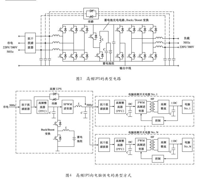 交流UPS包括工頻UPS與高頻UPS兩種機(jī)型,用市電對電腦供電的典型方式多采用集中供電方式。以圖3所示的高頻UPS為例,用圖1及圖2可以畫出它的集中供電方式如圖4所示。仔細(xì)地對這種集中供電方式進(jìn)行分析可以發(fā)現(xiàn),它存在有很多的缺點(diǎn):