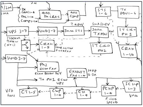 解鎖真正預測數據中心的成本和能源的能力,DCIM應該能夠提供對未來的預測,讓數據中心運營商知道數據中心不同的負載和溫度條件下的反應,以及跟蹤項目的主要設施的利用能力。這一個方法是通過性能模型體現的,其中包括在電力和冷卻鏈的主要機械和電氣基礎設施(見圖4)。該模型取代了以前繁重的手工構造的模型(見圖1)。
