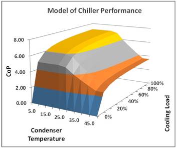 圖3曲線的主要特征是當冷凝器溫度升高超過30°C時,當冷卻負荷接近100%時,能效比急劇下降。在圖3中的冷水機組的復雜性是一個單一的子系統組件中集中了各種數據中心的關鍵組件,這些組件的設備中的功率和熱量的分布之間相互作用。例如,制冷機組在冷卻負荷時從配電板或面板的電源進行供電,表示機械裝置和電氣裝置之間的相互作用。