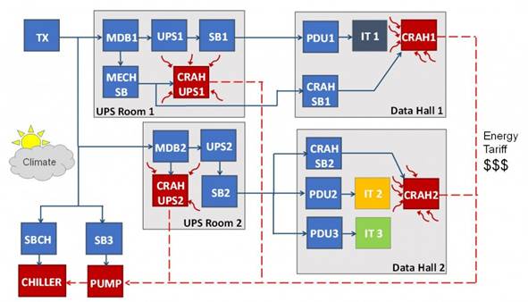 圖4 確定電源和冷卻鏈的組合數據中心的性能模型(藍色連接代表的是電源鏈,紅色連接代表的是冷卻鏈)。