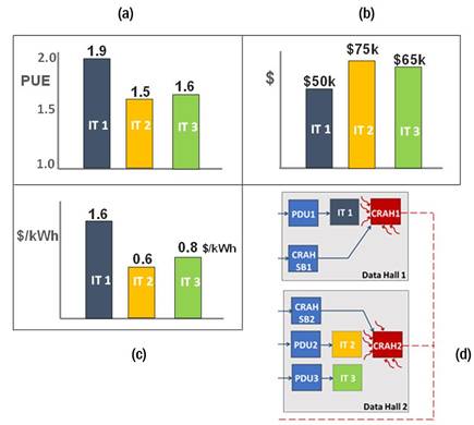 鑒于工程問題可以通過性能模型在圖4中得到解決,報告活動的指標成為一件容易的事。這些指標可能包括客戶級PUE,總成本和交付成本(美元/千瓦時)的類型,為高級管理層提供商業智能和決策能力。圖6顯示了在圖4中建模的數據中心中每個客戶的分配的度量標準。輸出來自工程模型,認為能源管理費用,是基于成本的資本和維護成本的指標。考慮圖6(a);分配客戶IT的PUE(1)比IT(2)和IT(3)要高很多。這一結果是作業績效模型圖4的結果,而由不同系列的UPS和不同類型CRAH單元組成的IT(1),比IT(2)和IT(3)交付成本更高。