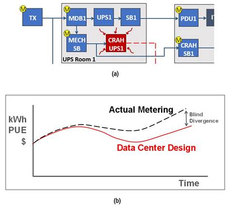 在圖5的(a)中所示的例子中,儀表被提名和數據中心的關鍵性能指標(KPI)跟蹤與預期設計性能(參見圖5b)。區別在哪里開始,見圖(5b)。它只是通過繪制的健康預期的設計從模型讀取可見。發散的常見原因是人工干預,其中有人已經改變了設置,冷卻系統或系統已經響應產生不利于載荷狀況,但只是在一定程度上還尚未成為危險項目。如果早按照圖5檢測(b)所示,設施人員能及時處理,并試圖恢復分歧的差距,并將數據中心帶回到設計。