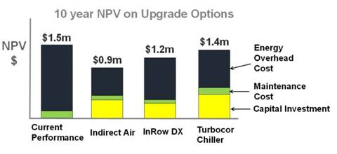 該模型需要從所有的主要數據中心項目的性能和數據的輸入,以允許在一個組件和/或系統級的數據中心容量利用率的評估。它有助于數據中心的計劃,并為即將到來的基礎設施維護和增強計劃,它可以幫助評估設施升級選項,而不需要長期的、復雜的、充滿錯誤的電子表格。圖8給出了一個10年的凈現值(NPV)為冷卻系統升級的計算,考慮到對能源的開銷,維修成本和所需的資本投資。在這種情況下,它很容易在較短的時間內評估升級選項的內部工程團隊,并排除那些不提供一個成本效益的商業案例。在圖8的基礎上,安裝Turbocor制冷機組10年以上將對成本沒有什么影響,而采用間接冷卻系統可以節約60萬美元。
