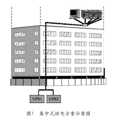 由一臺UPS組成單機供電系統、多臺UPS組成并聯供電或雙總線供電系統,再通過配電集中給負載供電,這種供電方案一般情況下UPS系統與機房用電設備是分開的。該供電方案一般UPS的單機容量在200~400kVA較多,供電示意圖如圖1所示。