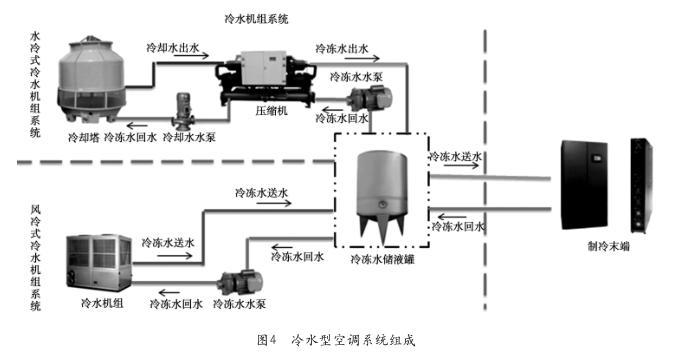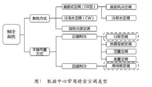 在目前的精密空調主流應用中,從末端布置方式而言,主要有近端制冷的行級空調和遠端制冷的房間級空調兩種;從散熱方式而言,分直膨式散熱和冷凍水散熱兩種方式,數據中心常用制冷系統如圖1所示。