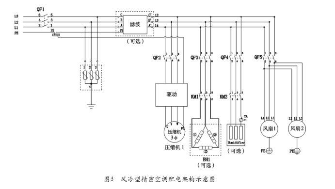 直膨式精密空調的供電采用三相電源制式,電源范圍一般為380~415Vac/50Hz,380~415Vac/60Hz,和440~480Vac /60Hz。在空調系統啟機時,一般是先啟動室內機(風機,控制系統等),然后啟動室外冷凝器,再啟動制冷壓縮機。圖3為風冷型精密空調的配電示意圖,從 配電架構并結合啟機時序,在考慮UPS供電時,需參考室內精密空調的風機、控制系統、室外冷凝器和制冷壓縮機的供電需求,選擇合適的UPS,達到配電的高 性價比。