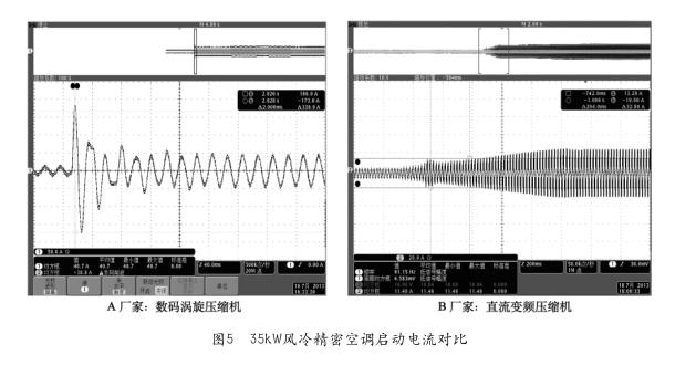 根據A、B兩個廠家提供的技術參數并結合測試結果,采用數碼渦旋壓縮機的DX型精密空調,其啟動沖擊電流約為額定電流的5倍;而采用直流變頻壓縮機的DX型精密空調,其啟動電流小于額定電流。