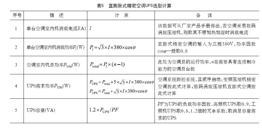 (1)直膨脹式精密空調UPS選型建議(見表5)