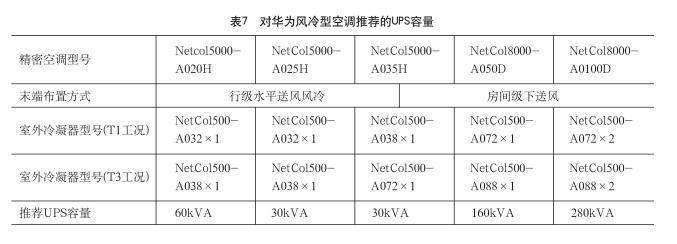 考慮對華為公司提供的風冷型精密空調全部采用UPS進行配電,根據推薦的配置部件,按照上述配置原則,推薦的UPS容量見表7。