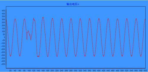將具有IGBT短路檢測功能的兩個UPS模塊插入UPS機柜,短路其中一個功率模塊的逆變IGBT,利用功率模塊的故障錄播功能,功率模塊在發生逆變IGBT短路時自動保存逆變IGBT短路時刻前后的輸出電壓波形。該波形如下圖所示: