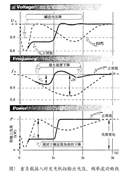 在某國(guó)外知名品牌柴油發(fā)電機(jī)組上做過(guò)接入重負(fù)載試驗(yàn),測(cè)試曲線如圖1所示。