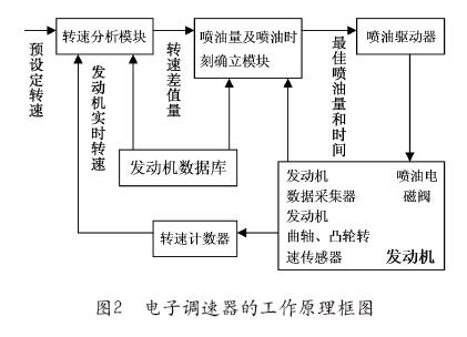電子調(diào)速器的特點(diǎn)是,它將發(fā)動(dòng)機(jī)的各功能部件的工作狀態(tài)智能地聯(lián)系并協(xié)同成一個(gè)整體,綜合研判它們的實(shí)時(shí)參數(shù)并求得最佳值,以此作為指令將燃油按照最適宜的時(shí)刻和油量由電磁閥(油門(mén))噴入汽缸爆燃,驅(qū)動(dòng)主軸轉(zhuǎn)動(dòng),使發(fā)動(dòng)機(jī)在額定的輸出功率范圍內(nèi),無(wú)論被驅(qū)動(dòng)負(fù)載怎樣變化,都能以迅速、精確的調(diào)控確保轉(zhuǎn)速穩(wěn)定在25r/s。它的工作程序是:位于主軸和凸輪軸的兩個(gè)轉(zhuǎn)速傳感器將信號(hào)送至轉(zhuǎn)速計(jì)數(shù)器,得出實(shí)時(shí)的發(fā)動(dòng)機(jī)轉(zhuǎn)速,并在轉(zhuǎn)速分析模塊與來(lái)自數(shù)據(jù)庫(kù)的最佳算法及預(yù)設(shè)轉(zhuǎn)速一起解析求出轉(zhuǎn)速差值。噴油量及噴油時(shí)刻確立模塊把轉(zhuǎn)速差值、數(shù)據(jù)庫(kù)來(lái)的典型值和從發(fā)動(dòng)機(jī)采集的相關(guān)數(shù)據(jù)進(jìn)行全面分析,確立出最佳的噴油量及噴油時(shí)刻并指令噴油驅(qū)動(dòng)器打開(kāi)噴油電磁閥,使發(fā)動(dòng)機(jī)既可將燃油充分地爆燃轉(zhuǎn)為驅(qū)動(dòng)主軸轉(zhuǎn)動(dòng)的機(jī)械能,又可減少污染物的排放。