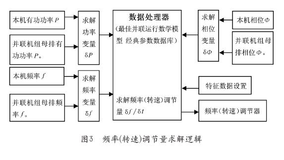 部分負(fù)載接入或撤出并聯(lián)機(jī)組母排的時(shí)刻,必然引起有功功率、無(wú)功功率在并聯(lián)的各機(jī)組之間重新平分,以致出現(xiàn)機(jī)組環(huán)流和各機(jī)組頻率的波動(dòng)。此刻,并機(jī)卡將本機(jī)的有功功率、頻率和相位與并機(jī)母排上的相對(duì)應(yīng)的這三個(gè)參量分別進(jìn)行求解,得到有功功率變量δP、頻率變量δf和相位變量δΦ。數(shù)據(jù)處理器依照最佳并聯(lián)運(yùn)行數(shù)學(xué)模型及經(jīng)典數(shù)據(jù)對(duì)它們計(jì)算、推演,求解出調(diào)節(jié)頻率最佳數(shù)值δf/δt作用于頻率(轉(zhuǎn)速)調(diào)節(jié)器和電子調(diào)速器,改變發(fā)動(dòng)機(jī)主軸、發(fā)電機(jī)轉(zhuǎn)子的轉(zhuǎn)速,使本機(jī)組頻率及有功功率的均分達(dá)到并聯(lián)機(jī)組良好運(yùn)行的條件。