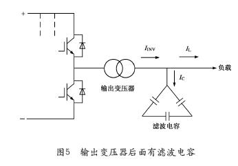 咱們知道變壓器后邊有濾波電容,它可濾掉高頻脈沖,關于50Hz頻率來說是一個固定電容支路。也即是說這個電容是并聯在輸出電壓上的,正常時就有一個容性電流流過。它與負載電流一起由逆變器經變壓器的電流承當,如圖5所示。
