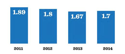 提升數據中心能源效率的第一步,便是審慎評估能源使用效率(PUE,Power Usage Effectiveness),簡單來說,PUE就是數據中心總耗電除以IT設備總耗電,或是數據中心總設施消耗的能源除以IT設備消耗的能源。PUE是由GreenGrid所召集的政府及產業專家組成的項目小組所制定的一項指標,不僅信賴度高,而且可以用來檢驗機房的能源效率,可以廣為適用于一般數據中心,目的是建立一個“一致且可重復使用的衡量指標”,提供數據中心管理者持續監控并改善能耗狀況。根據UptimeInstitute于2014年進行的調查研究顯示,全球業界平均PUE為1.7,高于2013年的1.67,但低于2012年的1.8,表示機房節能仍有改善空間(如圖1)。