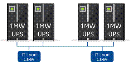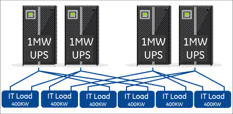 無(wú)論是塊冗余系統(tǒng)和共享冗余系統(tǒng)都比“N+1”冗余系統(tǒng)可靠性要高,其故障率每年不到一個(gè)事件。這種性能非常適合于大多數(shù)組織中的數(shù)據(jù)和應(yīng)用程序的實(shí)時(shí)傳遞,服務(wù)交付等核心業(yè)務(wù)。但這兩種冗余系統(tǒng)面臨的挑戰(zhàn)是,其UPS最大利用率通常小于70%~75%,而實(shí)際使用時(shí)由于其容量有限,效率還要少得多。塊冗余或共享冗余系統(tǒng)中,UPS和關(guān)鍵電力資產(chǎn)并沒(méi)有得到充分利用,而供電系統(tǒng)實(shí)際部署的關(guān)鍵負(fù)載可能會(huì)經(jīng)常變化,這是因?yàn)閿?shù)據(jù)中心運(yùn)營(yíng)中,經(jīng)常會(huì)有添加、刪除、升級(jí)或轉(zhuǎn)移IT負(fù)載、服務(wù)器等設(shè)備的情況。