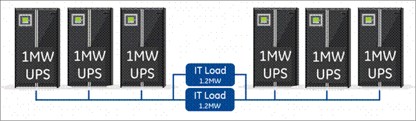 共享冗余4N/3系統(tǒng)的拓?fù)浣Y(jié)構(gòu)與塊冗余拓?fù)浞浅O嗨疲诙鄺l路徑分布著不同的負(fù)載,并且所有UPS模塊都被加載。而4N/3和3N/2系統(tǒng)都是共享冗余拓?fù)涞淖畛R?jiàn)形式,并且這些拓?fù)涞腢PS利用率水平通常在60%~70%的范圍內(nèi)。如在3N/2拓?fù)渲?,其UPS的最大負(fù)荷的利用率可以理解為2兆瓦的負(fù)載除以3兆瓦的UPS容量,其效率等于67%。