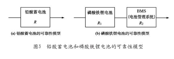 對于磷酸鐵鋰蓄電池組而言,由于其一致性差等固有缺點,就必須要有對蓄電池充電過程和放電過程進行管理等保護措施和相關的管理控制,故電池管理系統(BMS)或相關功能是必不可少的,并成為電池組的必要組成部分。理論上分析,在結構上相當于在裸電池后面串聯了BMS,即一個化學電源和一個電子電源設備的串聯,如圖3b)所示。其可靠性為R1×R2。因R1≤1且R2≤R1,故即使磷酸鐵鋰電池本身的可靠性R1與鉛酸蓄電池的可靠性R相同,R1×R2≤R,故可以得出磷酸鐵鋰電池的可靠性是要低于鉛酸蓄電池的。實際使用情況也是如此。