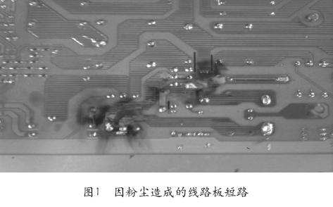當UPS采用風冷散熱時,會將空氣中的粉塵吸入UPS內部。粉塵粘附在風扇或電路板上,影響UPS散熱,并有造成電路板短路的風險。圖1為京滬高鐵箱變UPS電路板因粉塵導致的短路故障的照片。