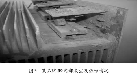 UPS對環境濕度有嚴格的要求,要求使用環境濕度10~90%RH不能結露。若濕度過高,在遇冷氣時,會在設備內形成水霧或細水珠,尤其在南方潮濕的雨季,結露容易造成電路板短路。商用UPS一般按照IEC529-598規定的IP20等級設計,即可以防止直徑大于12.5mm的外物侵入,防止手指接觸內部零件,沒有對濕度的防護要求。高速鐵路電力使用的UPS裝于箱變內,在戶外使用,箱變內沒有溫濕度調節系統,使用環境惡劣。圖2為箱變內某品牌UPS內部灰塵及銹蝕情況。