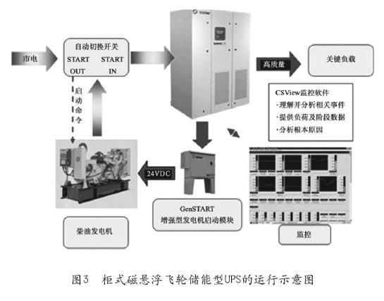 在傳統UPS供電系統中,當電力發生中斷時,蓄電池會支撐系統正常運轉,與此同時,柴油發動機開始啟動,以此保證數據中心主機正常工作、空調連續運轉。蓄電池型UPS在此過程中,提供了“分鐘級”的電力供電。而飛輪儲能型UPS受制于機械儲能,僅僅能夠提供30s到1min電力供電,這也是飛輪UPS被詬病的主要原因。然而,專家指出,如今,市電電源的可靠性達到99.9%,有些重要的負載都采用雙路市電供電,市電的可靠性可以說已經達到了99.99%。萬一市電中斷,后備電源的可靠性也可以達到99.9%,從市電到后備電源的切換,在技術上只需要10s的時間,這是一個公開的標準。目前,歐洲可做到8s。可以斷定,飛輪儲能型UPS能提供30s的電力完全能夠滿足從市電到后備電源的可靠切換的要求。圖3給出了柜式磁懸浮飛輪儲能型UPS的運行示意圖。