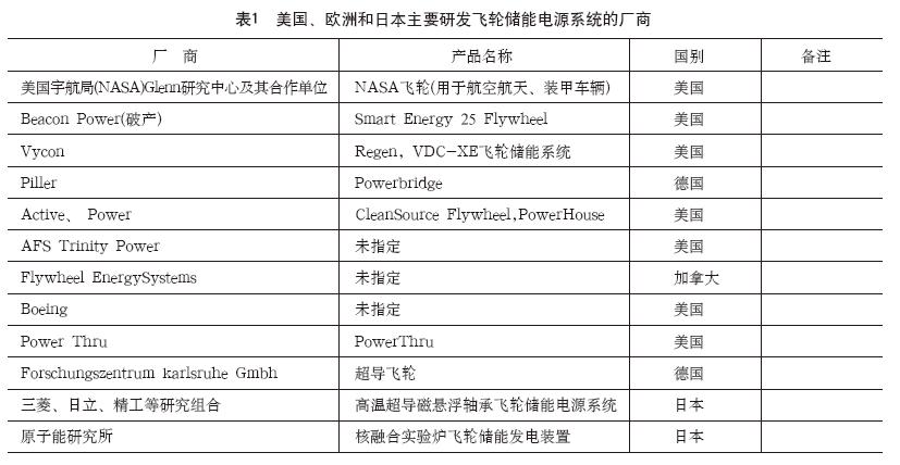 表1給出了美國、西歐和日本幾個著名的飛輪儲能電源系統的廠商。