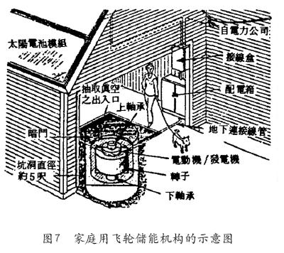 對于普通家庭,儲能式飛輪也有廣闊的應用前景。家庭用電系統可以采用電力公司供電、太陽能電池組、風力發電機組及微型汽油發電機來保障家庭的電源的不間斷供應。而平時多余的太陽能和風能首先可以給后備的飛輪儲能機構以及電池組充電,其次也可以用來給室內加熱取暖,再次可以通過逆變器給電網反饋,并取得收益。圖7為家庭用飛輪輪能機構的示意圖。