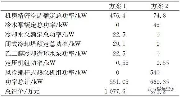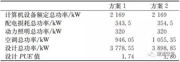 由設(shè)計PUE值可以看出,方案1設(shè)計PUE值低于方案2設(shè)計PUE值。