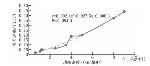 當功率密度(x)大于10 kW/機柜時,由于二次項系數為主因子,并決定整個多項式的值,因此溫升速率(y)與功率密度(x)更接近二次多項式關系:y=0.002 4x2+0.027 5x+0.000 3。根據多項式擬合關系式進行擬合數據外推,可以導出10~30 kW/機柜功率密度范圍內的溫升速率。