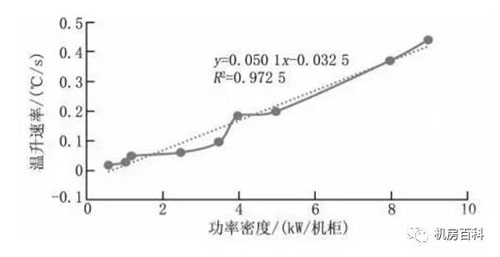 將擬合關系式改寫成y=0.1x×0.024x+0.027 5x+0.000 3,并對擬合關系式的多項式系數進行主因子分析,可以發現:當功率密度(x)等于10 kW/機柜時,二次項因子為0.1×10×0.024×10=0.24,小于一次項因子0.027 5×10=0.275。當功率密度(x)小于10 kW/機柜時,一次項系數為主因子,并決定整個多項式的值,因此可簡化為一次多項式,即在功率密度小于10 kW/機柜時,溫升速率(y)與功率密度(x)更接近線性關系:y=0.050 1x-0.032 5(如圖5所示)。比較圖4和圖5擬合曲線的殘差R2也容易看出,當功率密度(x)小于10 kW/機柜時,在現有試驗數據條件下用線性關系式表達擬合關系更準確。