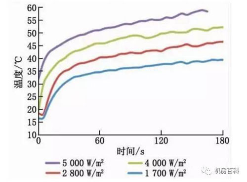 對不同功率密度下數據中心冷卻失效后的溫升情況進行了研究,結果見下圖冷卻失效時間在180 s內,因此曲線比較平緩,并且不同曲線的基準溫度不同。