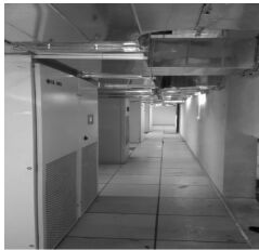 黑龍江綏化某數據機房原有空調系統為全空氣系統, 配有兩臺精密空調、兩臺加濕器如圖 2,圖 3所示。采用高架地板, 下送上回的氣流組織形式。根據電子信息機房室內環境的要求, 以及企業對節能減排所提出的要求, 對該項目的空調系統進行了節能改造.改造后該機房采用蒸發冷卻與機械制冷聯動空調系統, 選用了4臺18000 m3/h風量的蒸發式冷氣機和4臺軸流式排風機如圖 4,圖 5所示。
