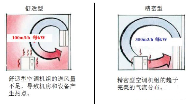 傳統(tǒng)的舒適性空調(diào)主要是針對于人員設(shè)計,送風(fēng)量小,送風(fēng)焓差大,降溫和除濕同時進行;而機房內(nèi)顯熱量占全部熱量的90%以上;風(fēng)速低,機房冷卻不均勻;不能滿足計算機的凈化要求;不配備加濕系統(tǒng),難滿足可靠性要求。