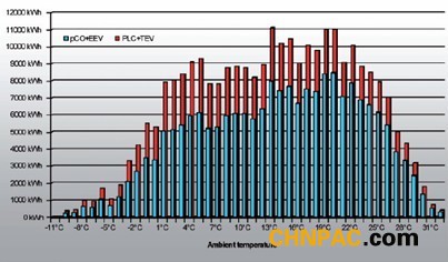 E2V的高效調理性和適應能力意味著空調體系能夠運轉在最大功率下。當室外溫度合當令(夜間或冬秋季月份),可將冷凝壓力下降至10bar,從而下降了耗電量。另一方面,機械式熱力脹大閥總是強制機組運轉在冷凝壓力超越17bar的情況下。在較熱的氣候情況下,電子脹大閥的長處是能夠更好地利用蒸騰器;在較冷的氣候下,其能夠下降機組的運轉壓力,從而下降耗電量,進步功率。