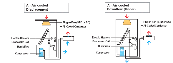 風冷式直接蒸發系統使用冷媒作為傳熱媒介。機組內的制冷系統由蒸發盤管、壓縮機、冷凝器等制冷管路組成,室內空氣穿過機組內部風道進行循環。將遠端的風冷冷凝器與室內機相連接,整個制冷循環在一個封閉的系統內,從而吸收房間內的熱負荷并排放到大氣中風冷式機組。