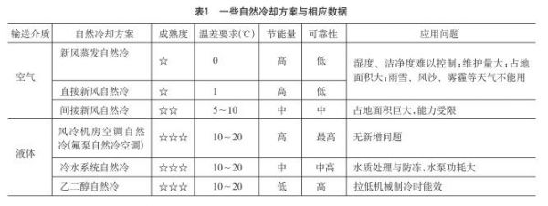 理論上,當室內(nèi)外溫差達到某個值時,自然冷卻系統(tǒng)就可以啟動運行。但由于系統(tǒng)可靠性、制冷量、工藝要求、實際效果等因素的影響,事實上卻不能啟動或沒有節(jié)能經(jīng)濟性,仍要靠機械制冷方式運行。把理論上可以自然冷卻,但卻由于種種原因不能利用的時間,稱為自然冷卻的“尷尬時段”。如何縮減自然冷卻的“尷尬時段”,成為各種自然冷卻方案所要解決的課題。對這些問題的解決或提升,成為自然冷卻方案成功與否的關(guān)鍵因素。表1給出了一些自然冷卻方案與相應數(shù)據(jù),可供參考。