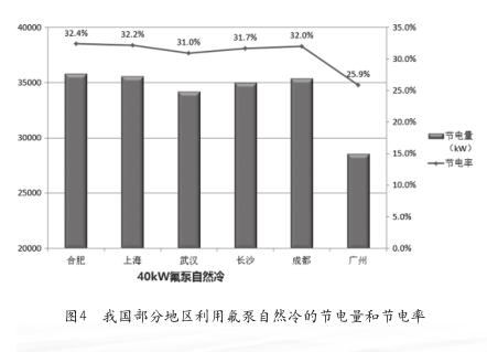 事實上,由于氟泵自然冷機房空調(diào)超強的節(jié)能能力和極短的“尷尬時段”,使其應用范圍已經(jīng)不再限于北方,長江以南同樣也取得了顯著的節(jié)能經(jīng)濟性,甚至連廣州,也有明顯的節(jié)能效果。圖4是我國部分地區(qū)利用氟泵自然冷的節(jié)電量和節(jié)電率。