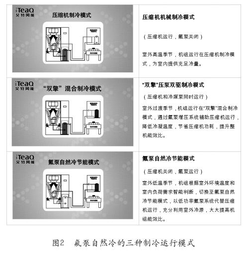 氟泵自然冷有三種制冷運行模式:壓縮機機械制冷模式、“雙擎”壓泵雙驅(qū)制冷模式和氟泵自然冷節(jié)能模式,如圖2所示。